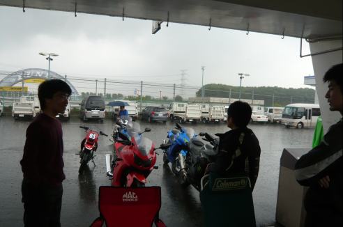 コースに泥水が流れ込んでくるほどだったので、サーキット側から様子見の判断が出て、しばらく中断です