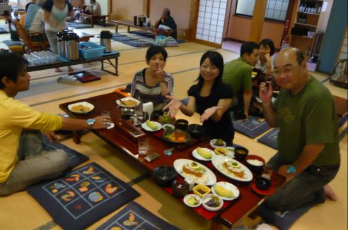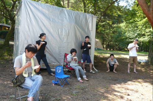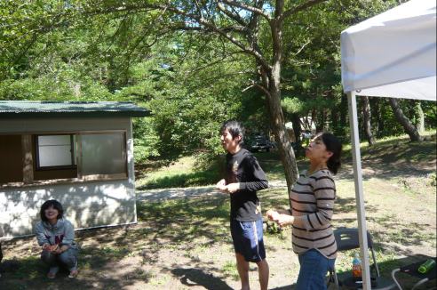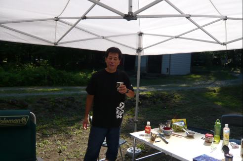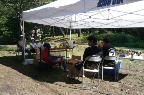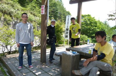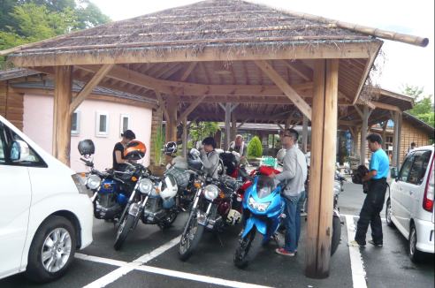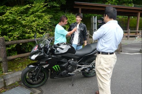 往路で試乗した、Ninja250RオーナーのH君がインタビューを受けています