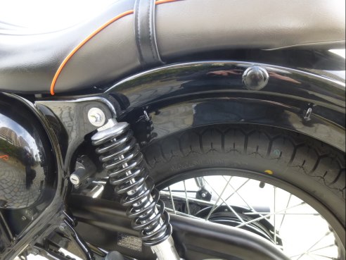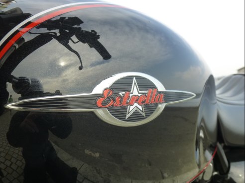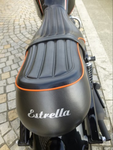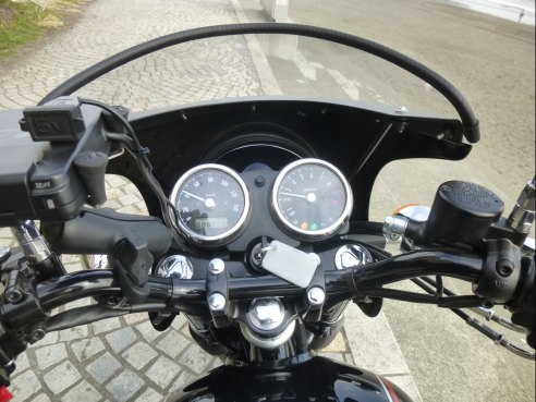 W800のものよりも少し小型で、エストレヤに合わせて作られた物のようですが、しっかりしたステーで固定されるので、社外の汎用品のように高速でブルブル震えるようなことも有りません。